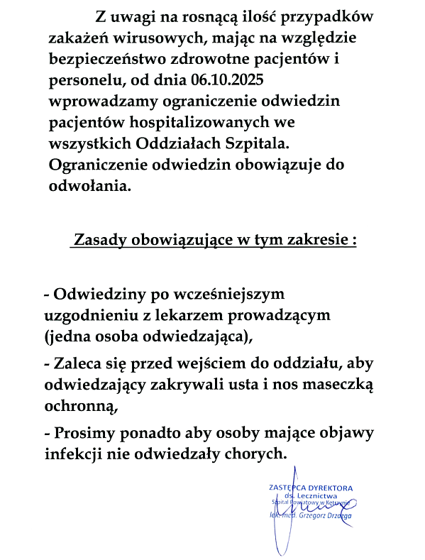 Szanowni Państwo, Informujemy, że z powodu zmiany operatora sieci telekomunikacyjnej, od 1 stycznia 2026 r., rejestracja do Poradni Szpitalnych działa w dni powszednie, w godzinach od 11:00 do 13:00, pod numerem tel. 89 751 25 02, wew. 15.