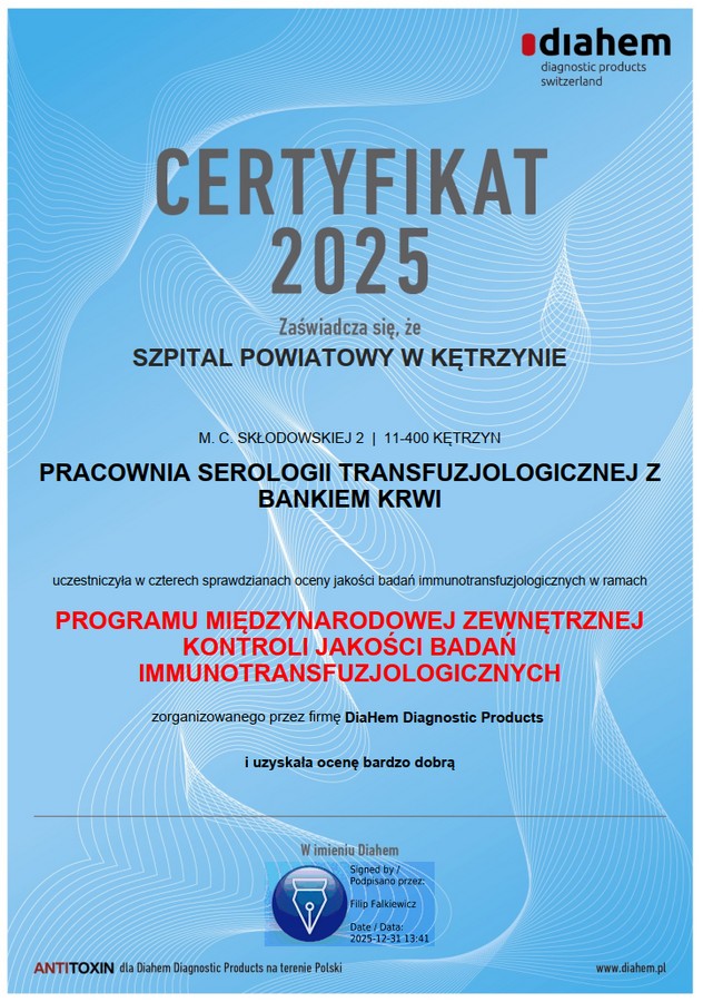 Potwierdzeniem wysokiej jakości naszej pracy są wysokie noty uzyskane w międzynarodowym programie kontroli jakości - Certyfikaty za 2015, 2016, 2017, 2018, 2019, 2020, 2021, 2022 i 2023 rok.